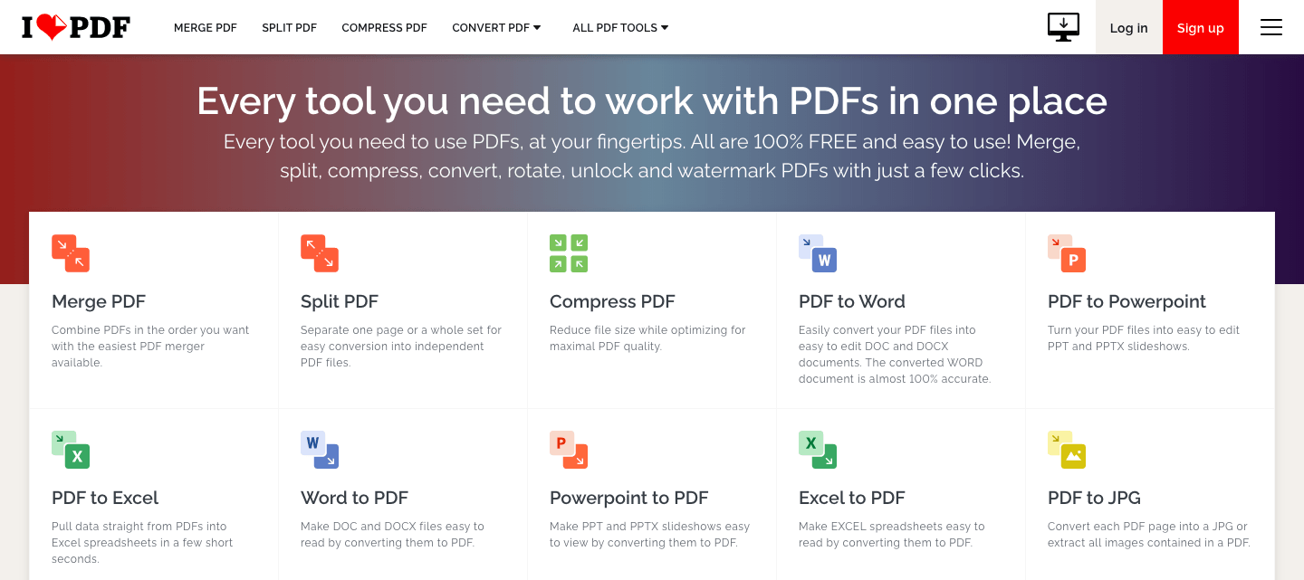 そこで活躍するのが「I Love PDF」で、ファイルサイズを小さくするだけでなく、PDF→WordやJPG→PDFなどファイル形式も簡単に変更できるのでオススメです。